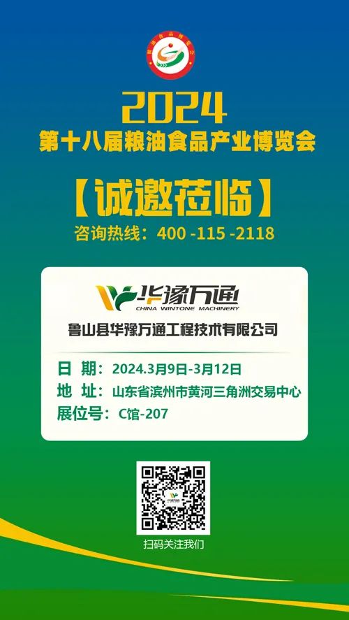 “新時代、新農業、新展會、新成果、新糧機、新合作”。第十八屆糧油食品產業博覽會,華豫萬通期待與您在濱州展會現場相見,共同見證糧油加工技術的創新發展。