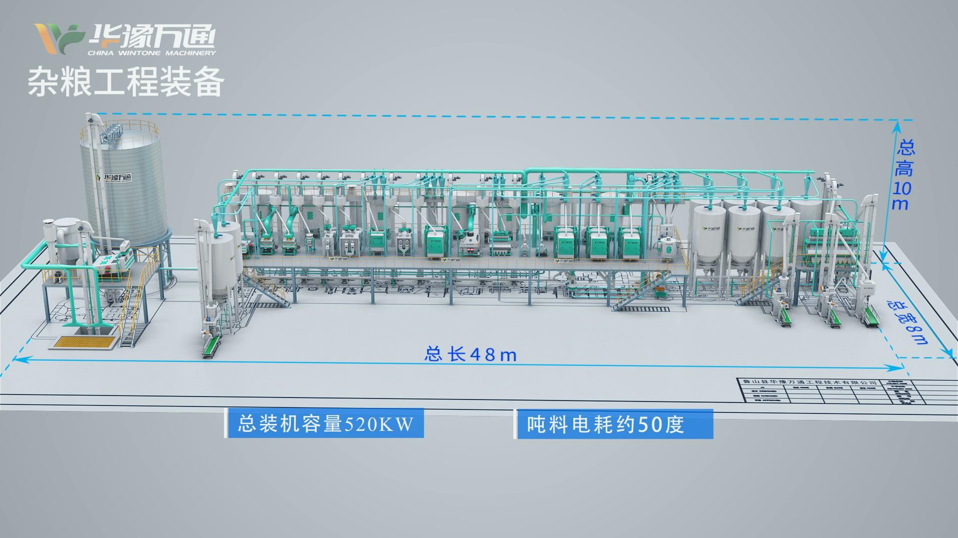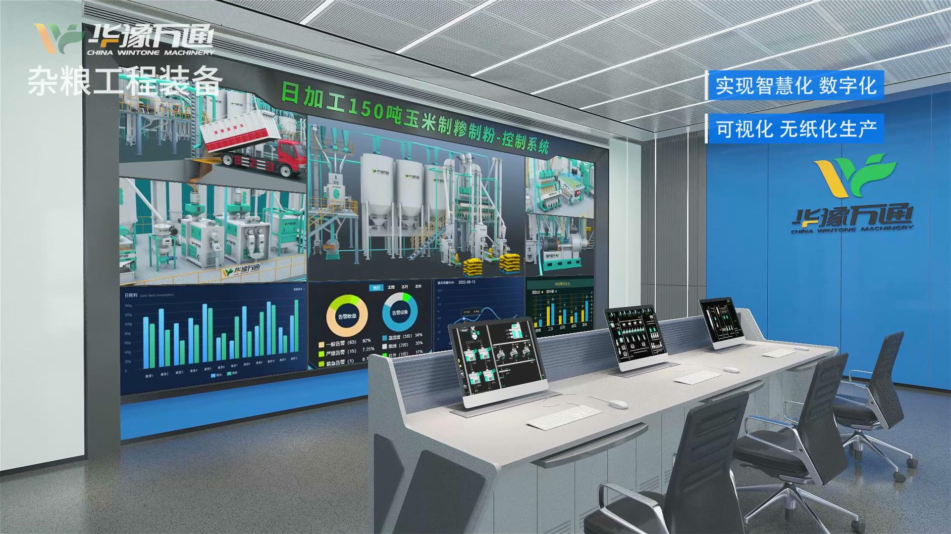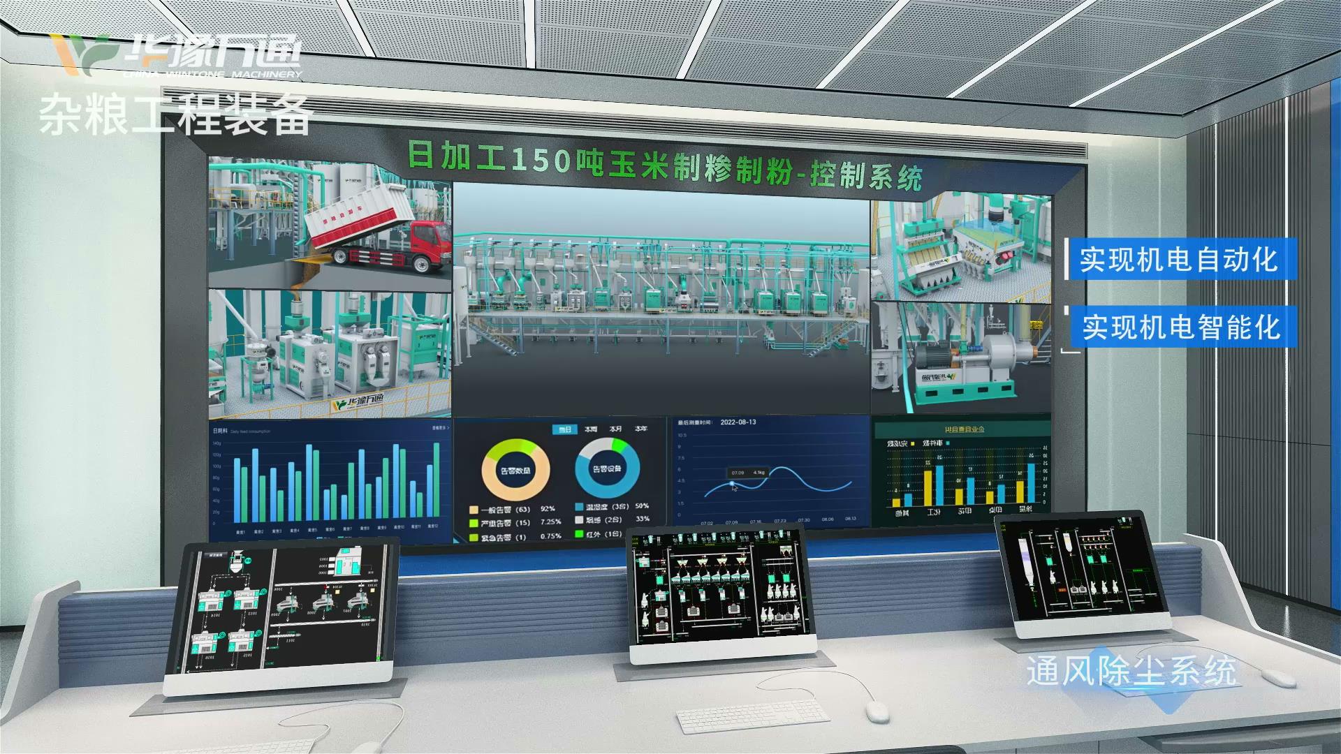 華豫萬通日加工150噸玉米制糝制粉創(chuàng)新工藝,設計為兩層平臺結構,三層設備布置,總長48m,寬8.0m,高10m,總裝機容量520kw,噸料電耗約50度,糝粉總收率≥65,糝內目測無皮、無黑星,粉內無麩皮,遠超國家標準。配備PLC智能化控制,可實現(xiàn)智慧化,數(shù)字化,可視化,無紙化生產(chǎn)。